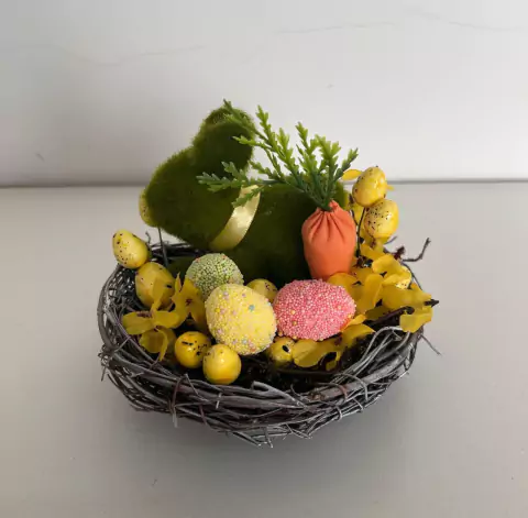 Arranjo de mesa ninho rústico com coelho musgo 15x15cm