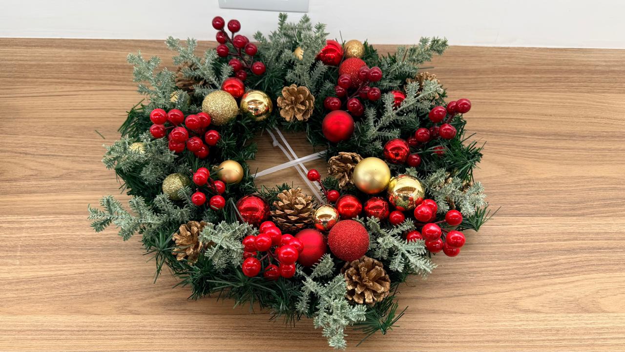 Arranjo de mesa redondo vermelho e dourado com 40cm de diâmetro.