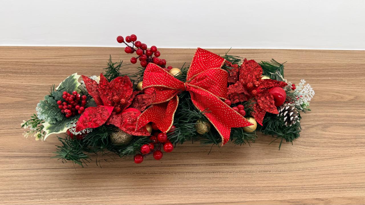 Arranjo de mesa com laço e flores vermelhos com 52cm de comprimento.