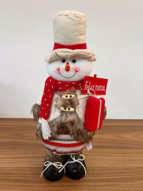 Boneco de neve com casaco tricot e pele com 38cm de altura.