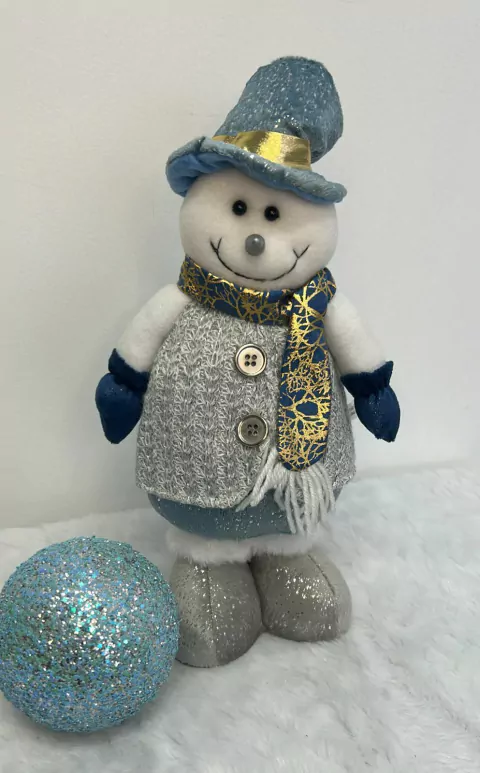 Boneco de neve cinza e azul com 35cm de altura.