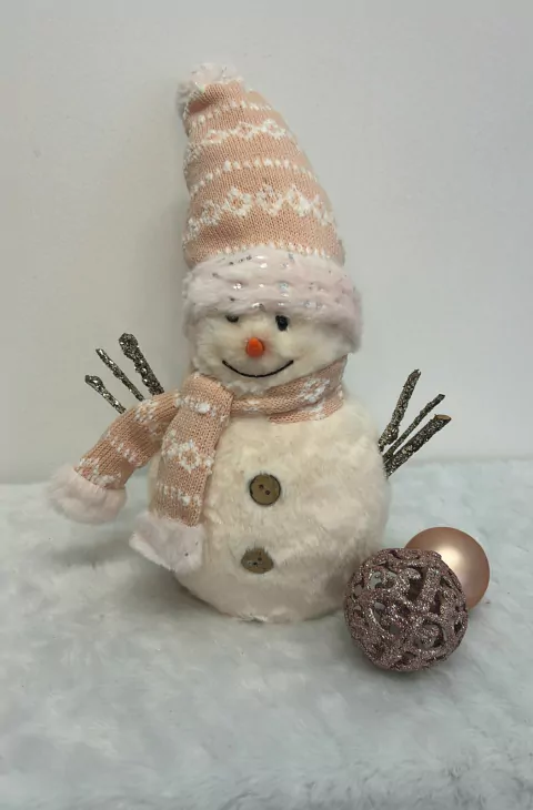 Boneco de neve com cachecol e gorro rosa , com 30cm de altura.