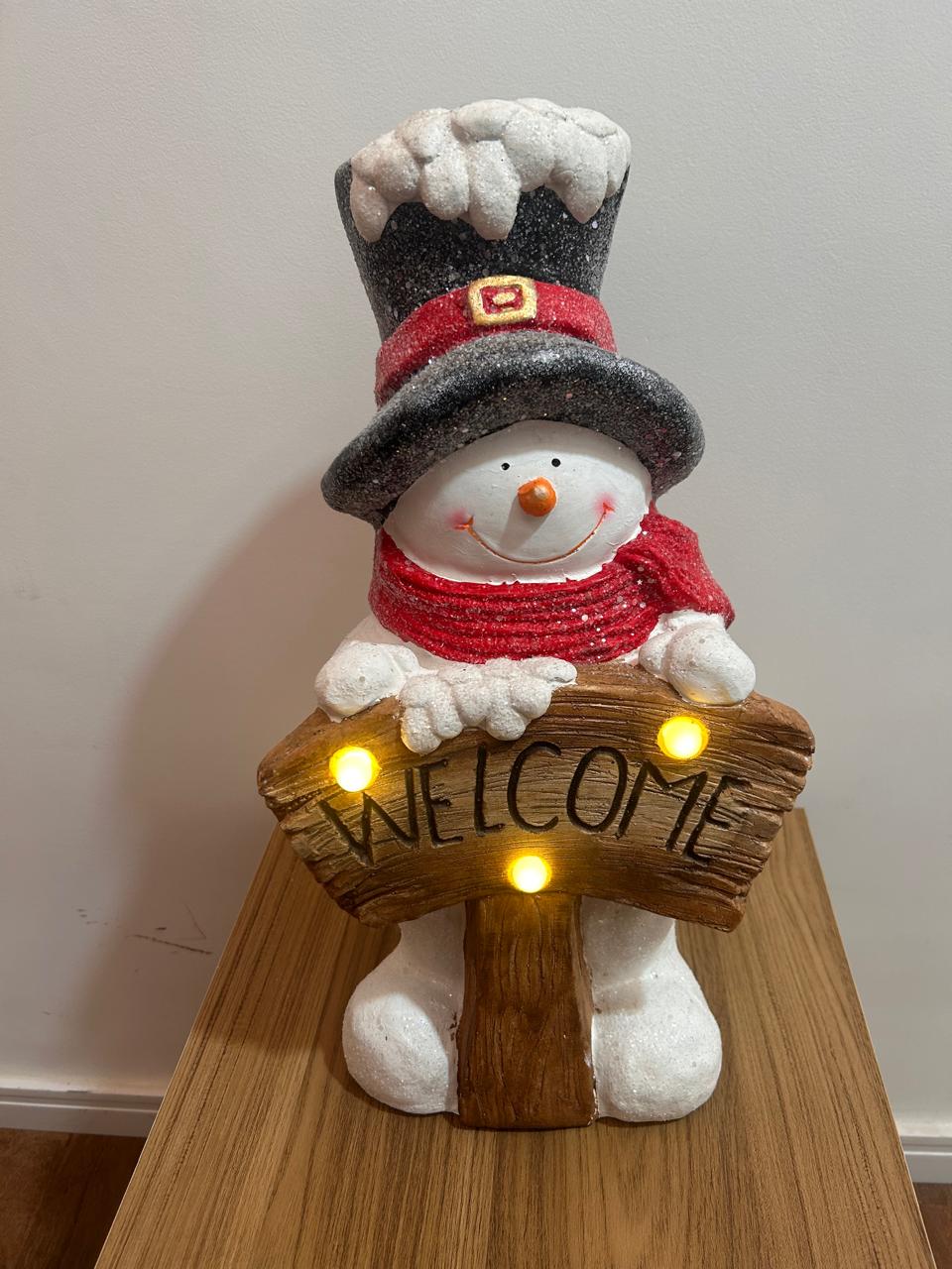 Boneco de neve de resina com led para área externa com 49cm de altura.