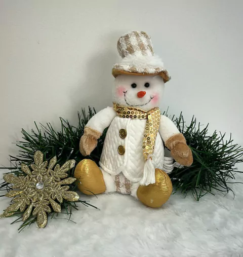 Boneco de neve sentado branco e dourado com 20cm de altura.