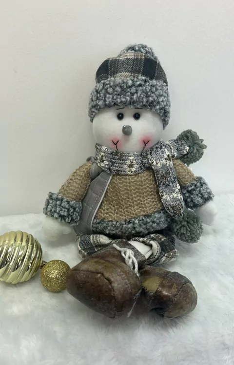 Boneco de neve sentado com casaco de trico e calça xadrez, de perninhas moles, com 38cm de altura no total.
