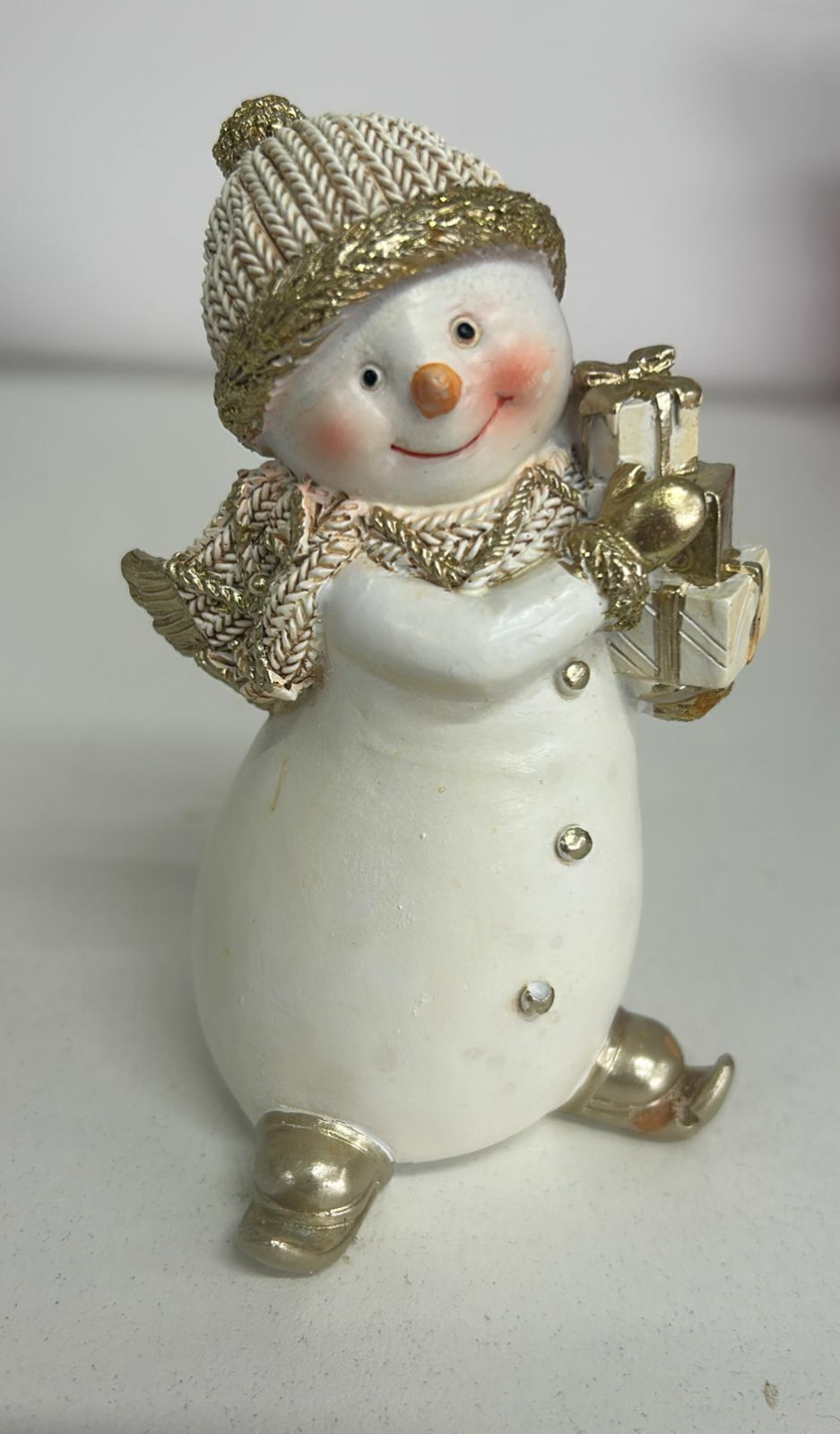 Boneco neve branco dourado com 13cm de altura.