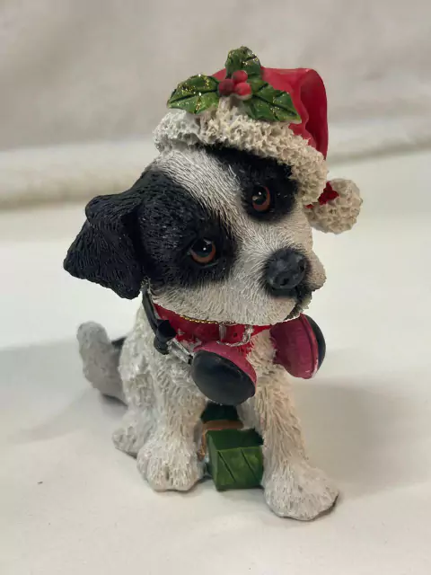 Cachorro preto e branco com gorro em resina com 12 cm de altura.