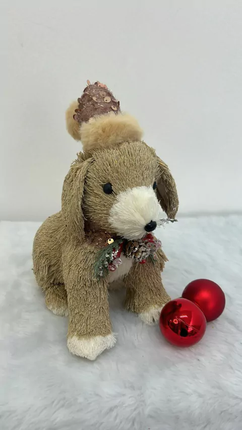 Cachorro sentado gorro rosa, com 19cm de altura.