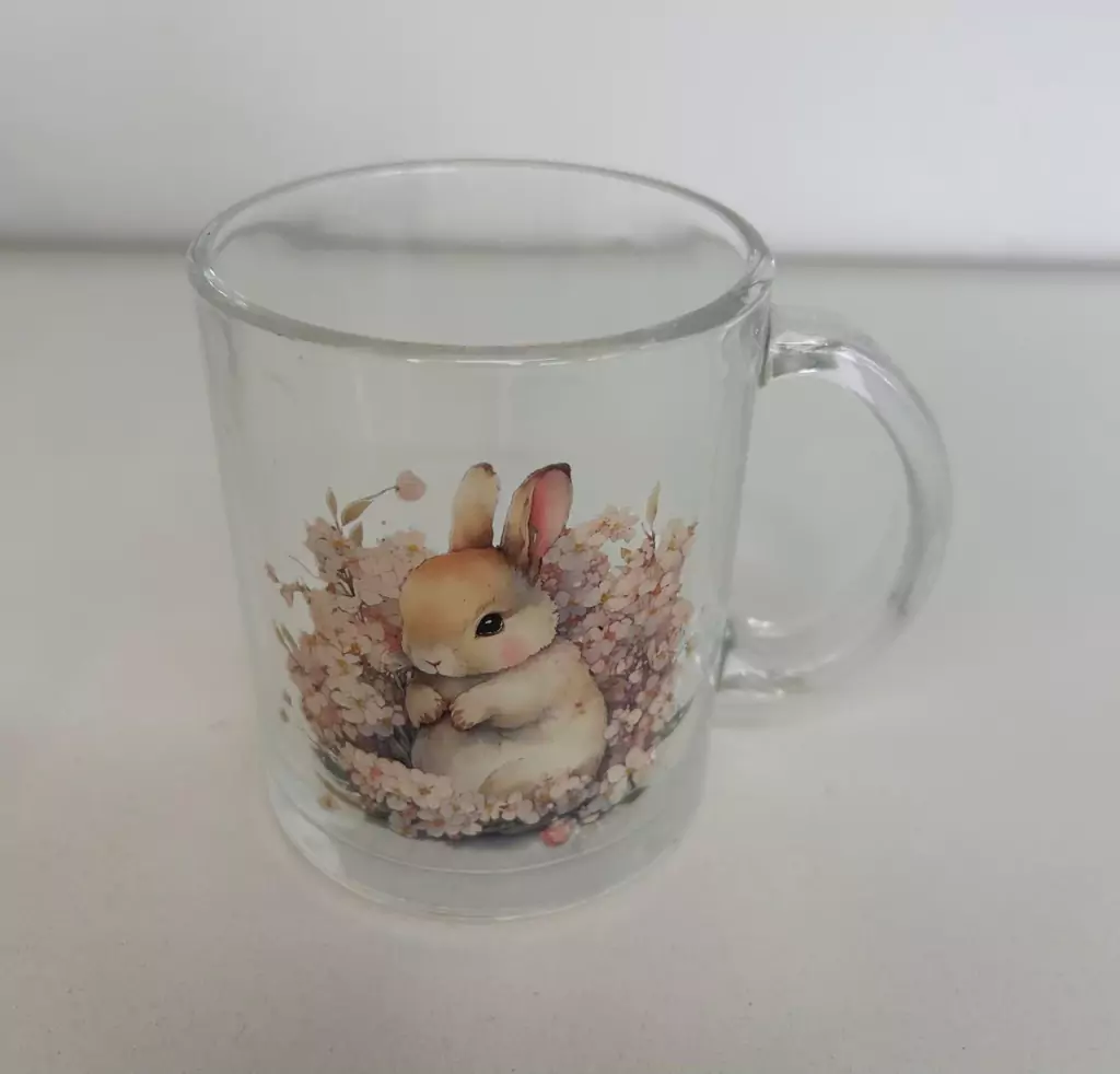 caneca de vidro com coelho