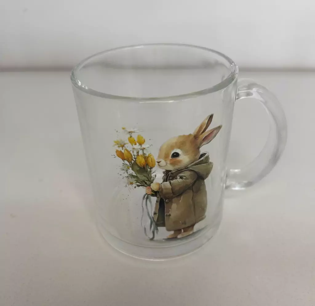 caneca de vidro com coelho