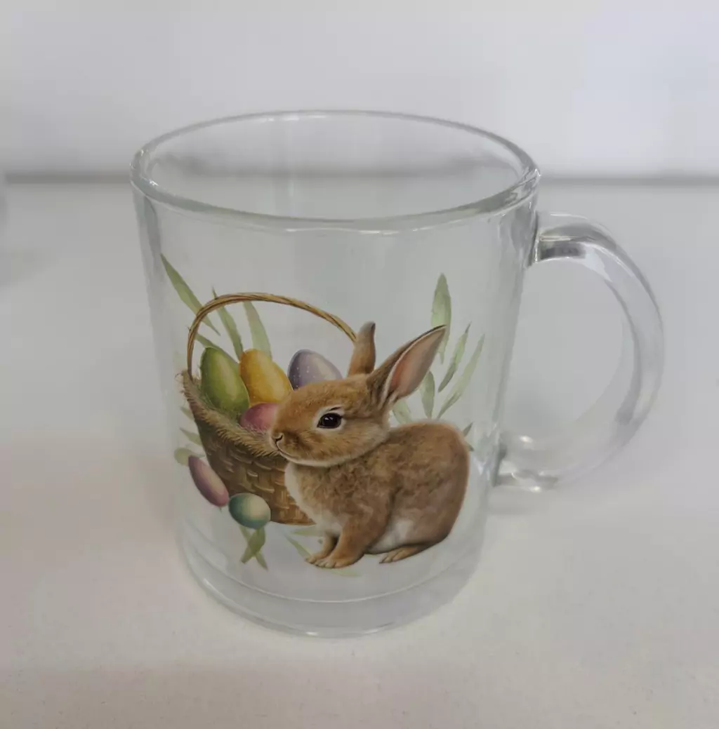 caneca de vidro com coelho