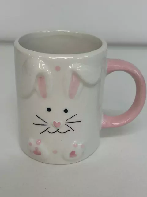 Caneca cerâmica branca e rosa, com carinha de coelho em relevo, com 9cm de altura.