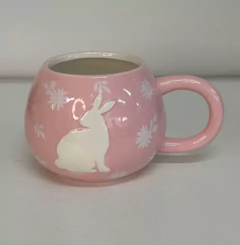 Caneca de cerâmica rosa, com relevo de coelho, com 10 altura x 17cm largura.
