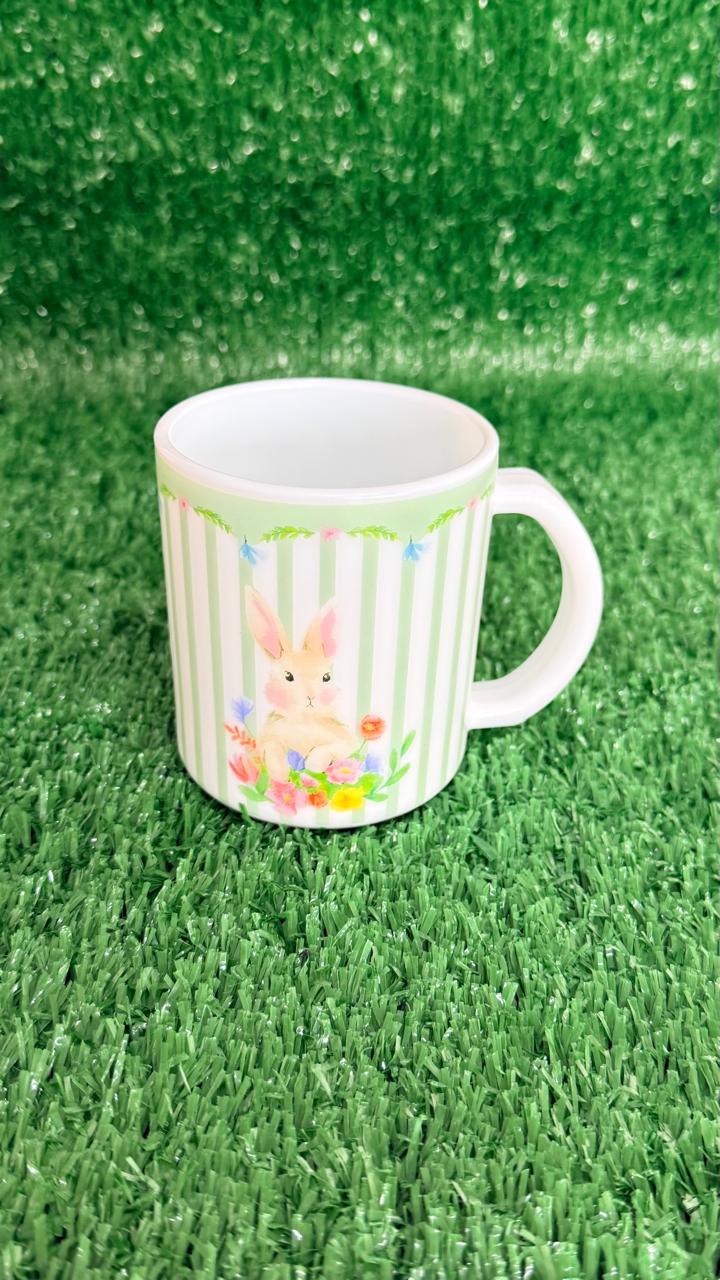 Caneca de vidro opalino listrada branca verde, com coelhos e flores 350ml