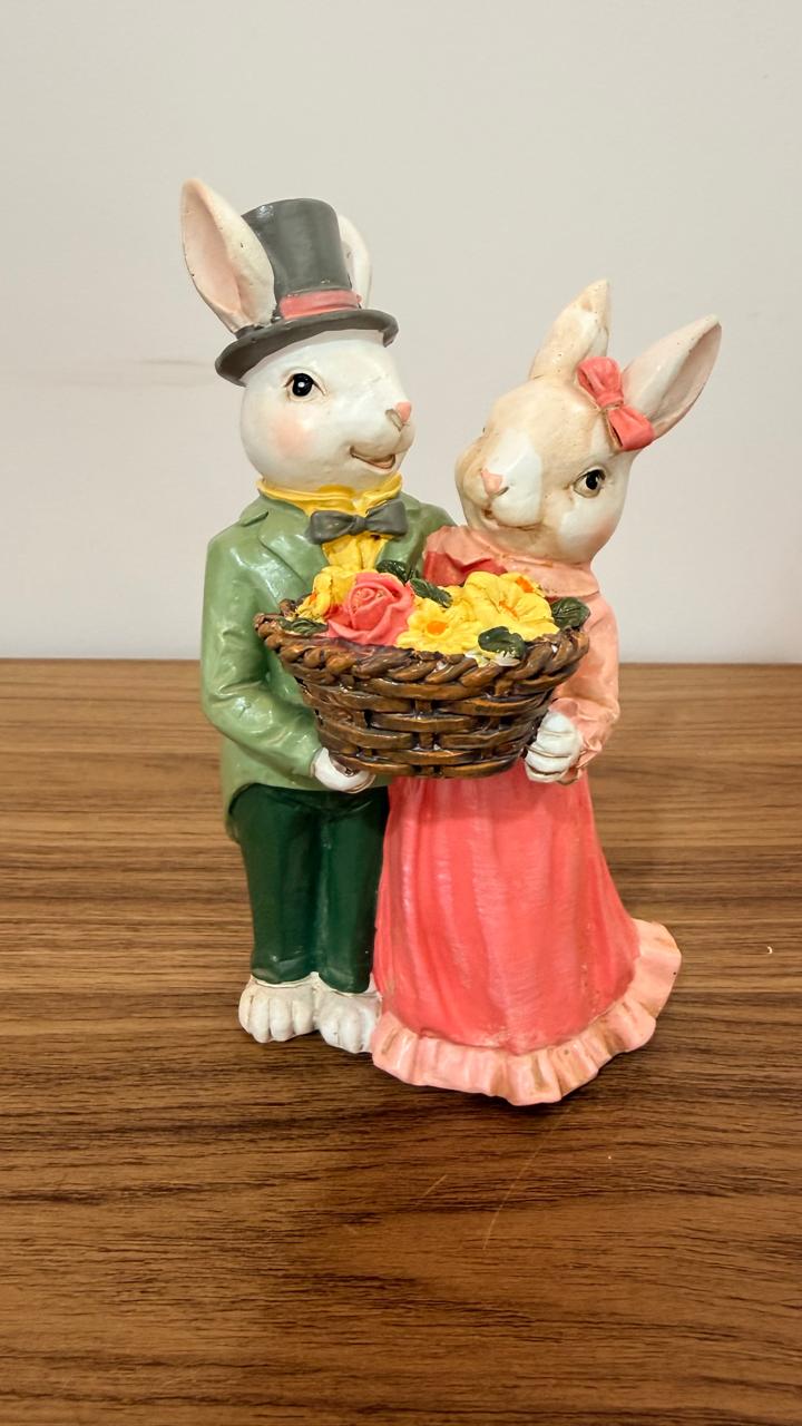 Casal coelhos com cesta flores resina 16cm quantidade