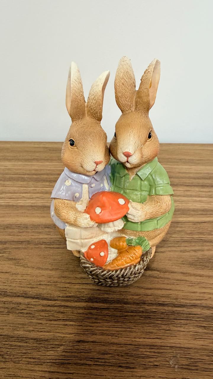 Casal de coelhos com cogumelo de resina com 14cm de altura.