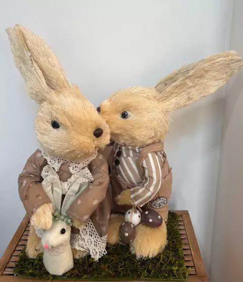 Casal de coelhos abraçados roupa bege, com 40cm de altura e 40 de largura.