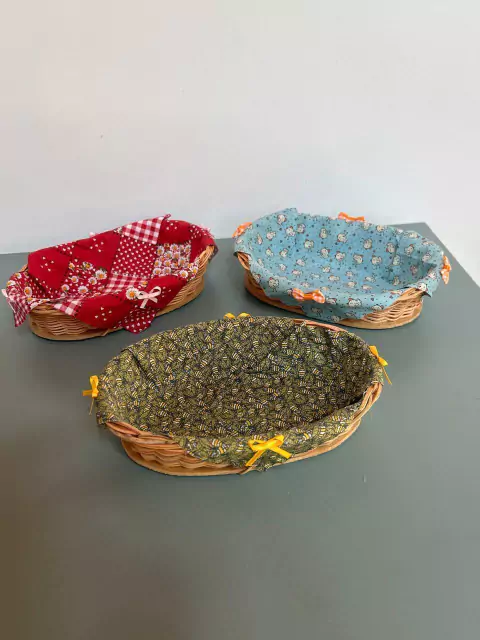 As cestas são decoradas com tecido e fitas, e podem ser feitas sob encomenda. Na foto alguns modelos disponíveis para pronta entrega.