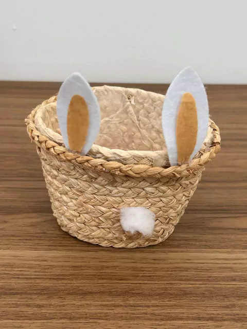 Cestinha de palha com orelhas de coelho, com 13cm de altura
