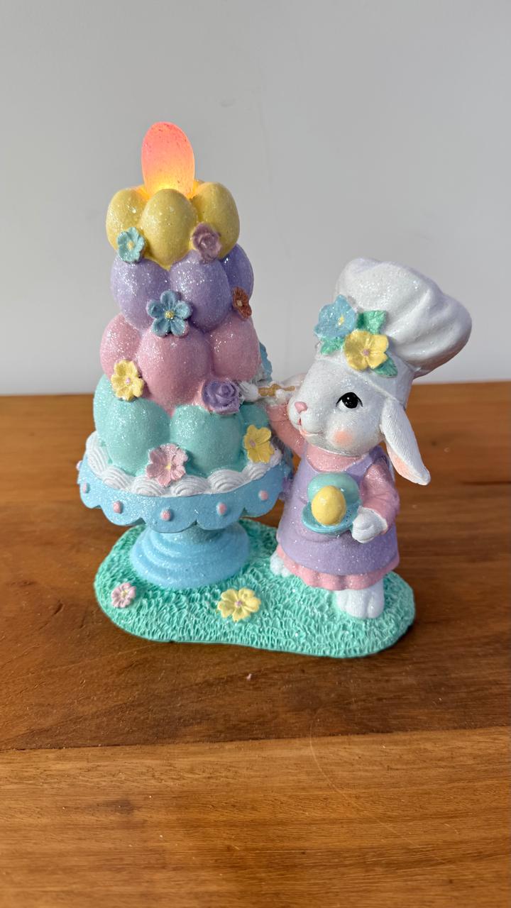 Coelha chef com bolo de resina com led, com 20cm de altura.