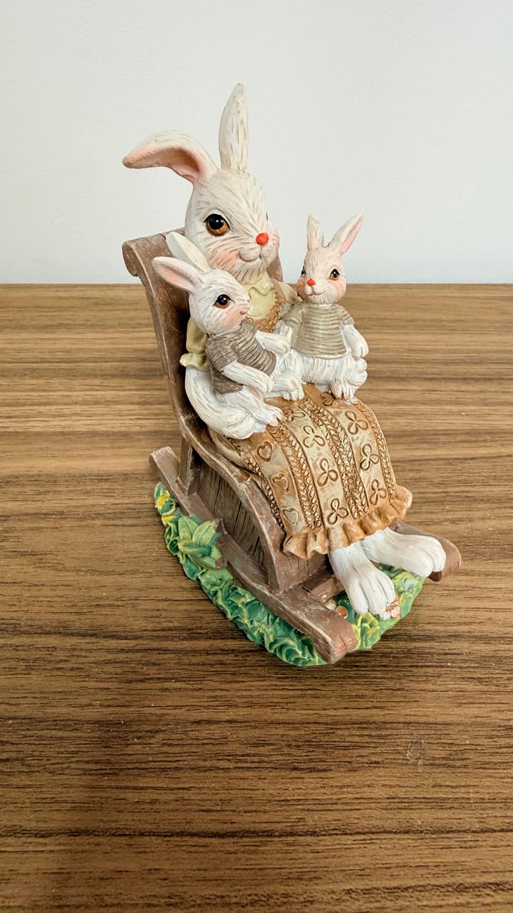 Coelha com filhotes na cadeira de balanço de resina com 13cm de altura.