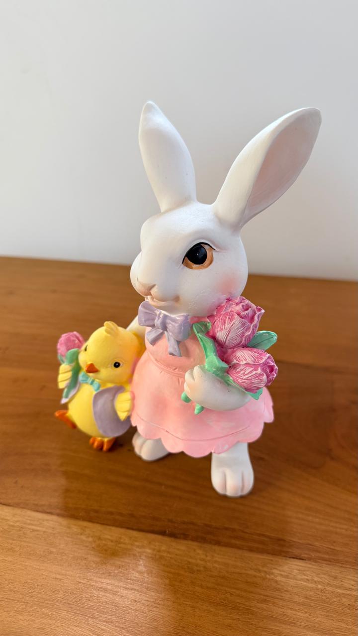 Coelha com flores e pintinho 19cm