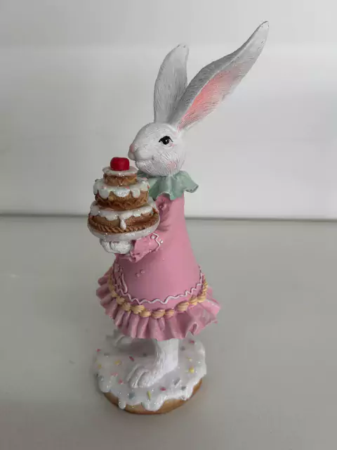 Coelha com vestido rosa e bolo de resina, com 27cm de altura.