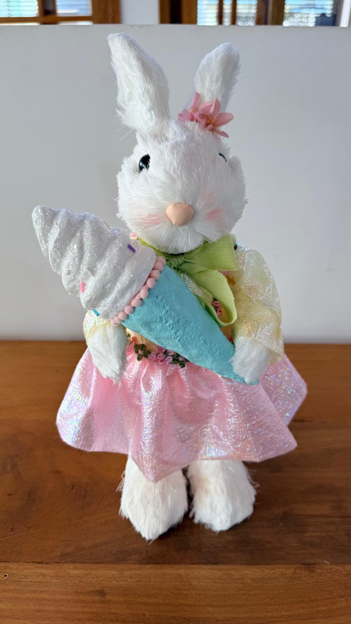 Coelha em pé de palha branca com sorvete, com 37cm de altura.