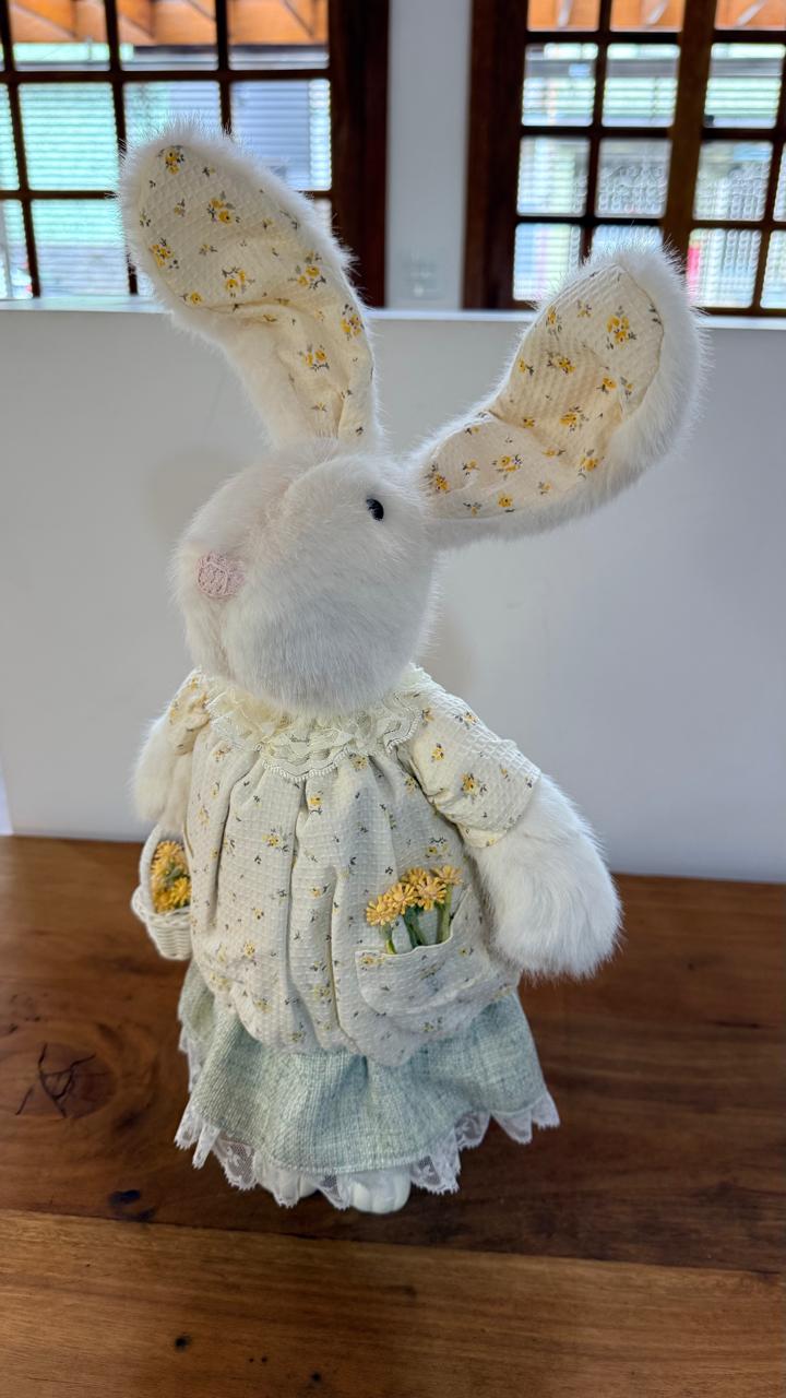 Coelha em pé roupa floral amarela com 50cm de altura.