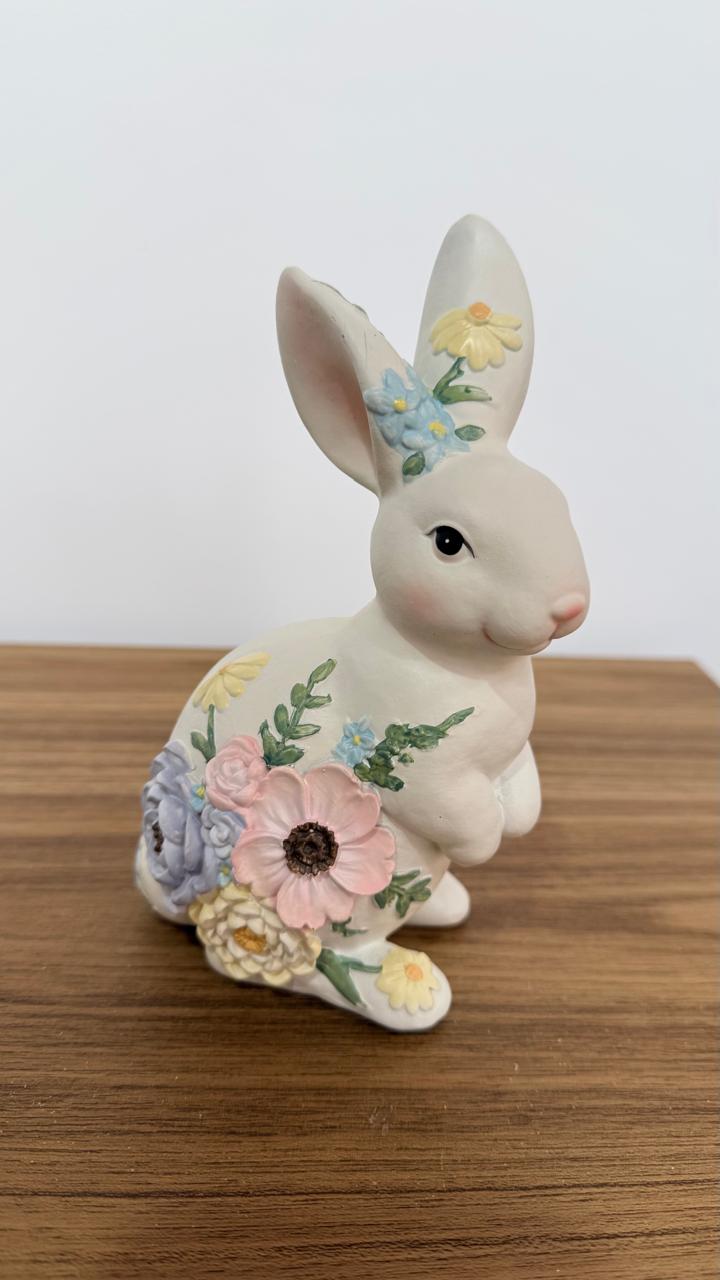 Coelha florida de resina com 17cm de altura.