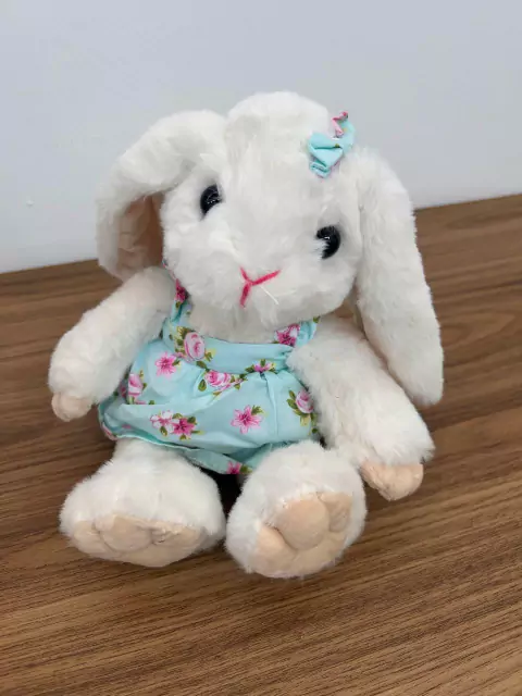 Coelha branca de pelúcia com vestido florido, com 20cm de altura.