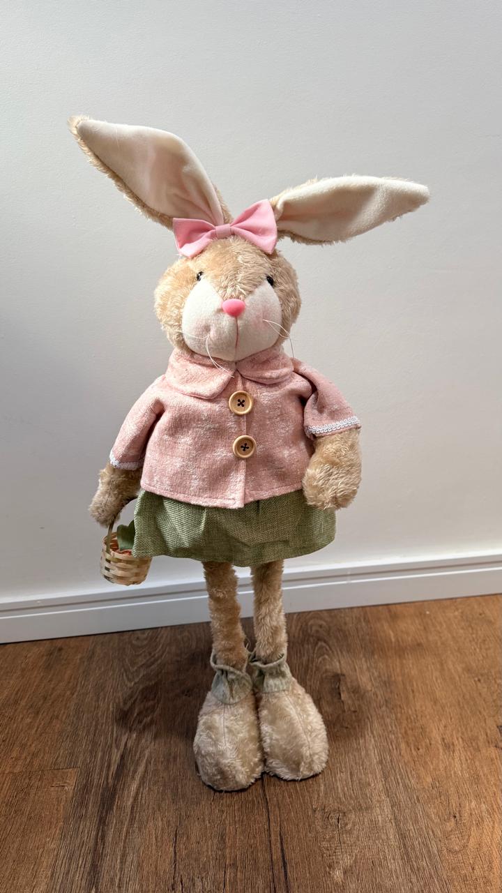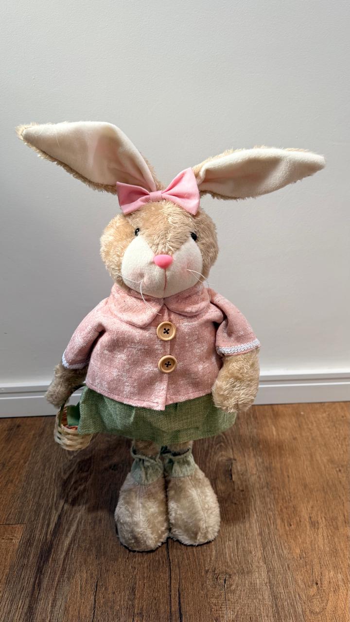 Coelha roupa verde e rosa retrátil, com 81cm em pé e 45cm abaixado.