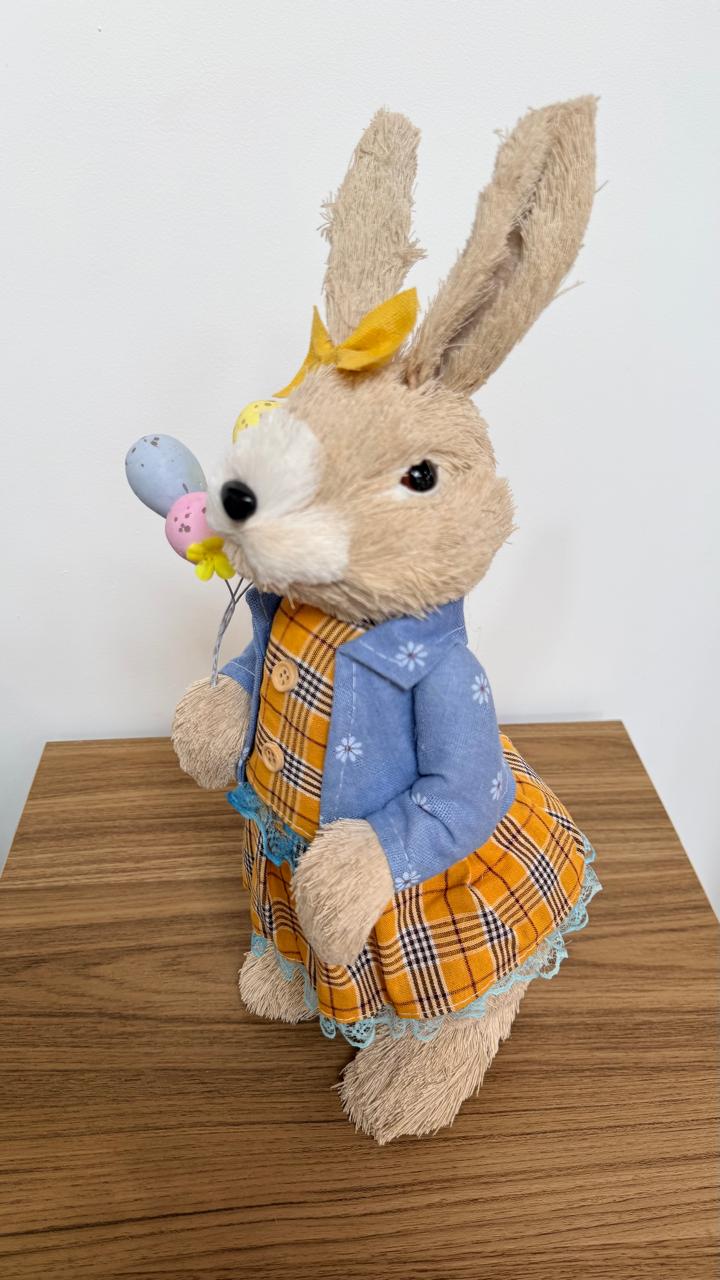 Coelha roupa xadrez e laço amarelo 42cm
