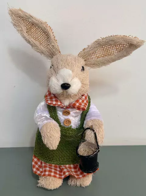Coelha rústica em pé vestido verde com 29cm de altura.