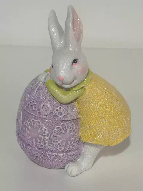 Coelho amarelo com ovo lilás em resina com 13cm de altura.