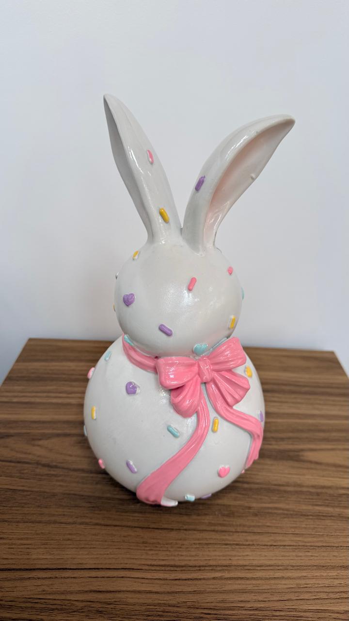 Coelho decorativo branco, detalhes coloridos e laço rosa 15x16x30cm