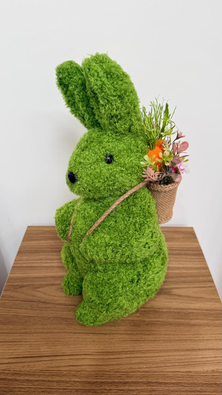 Coelho decorativo verde peludinho com cesta 40x16x20cm