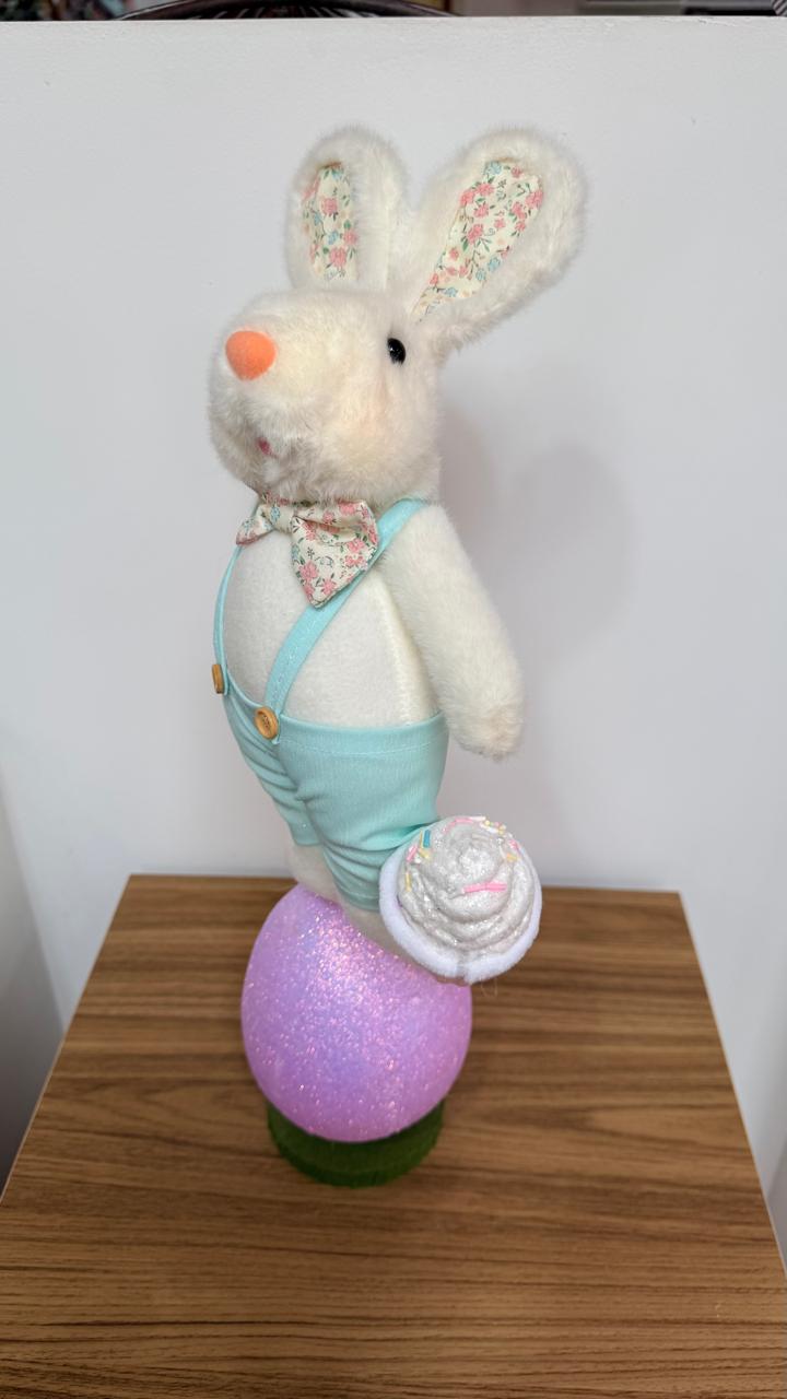 Coelho macacão azul em cima do ovo 51x13x20cm