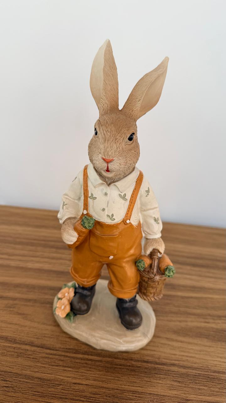 Coelho com macacão marrom de resina com 21cm de altura.