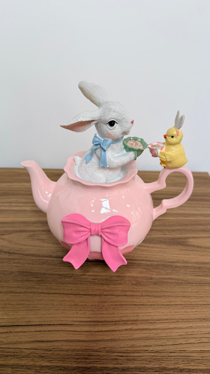 Coelho no bule rosa de resina esmaltada, com 20x25cm