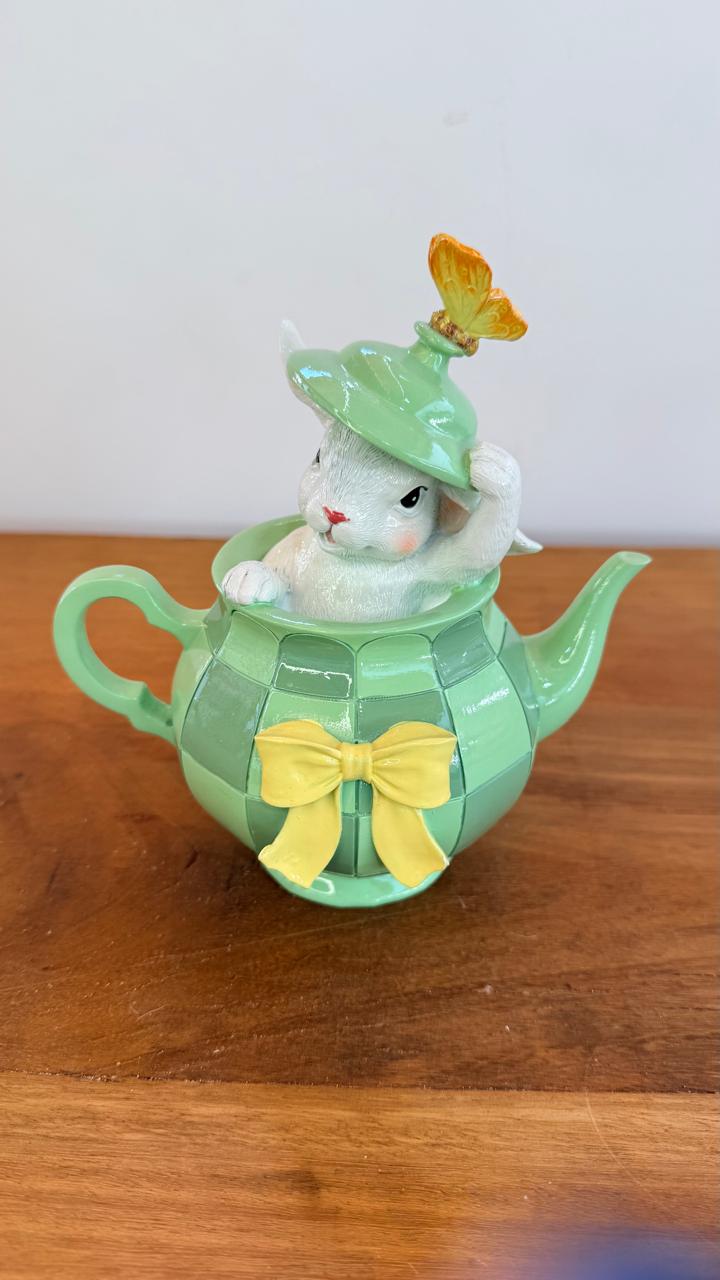 Coelho no bule verde de resina 18x11x16cm