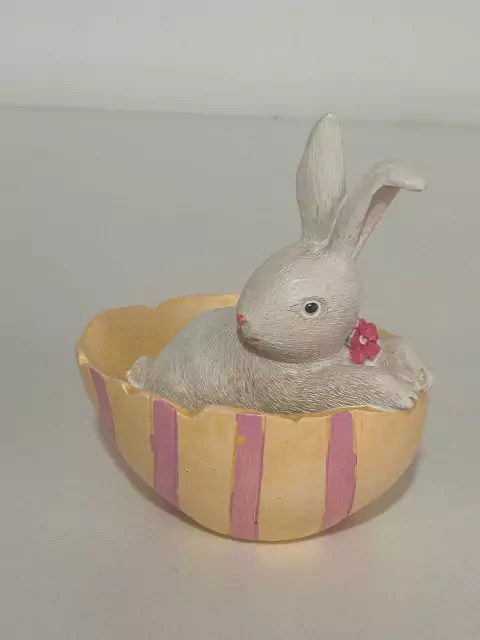 Coelho no ovo amarelo em resina, com 10cm altura.
