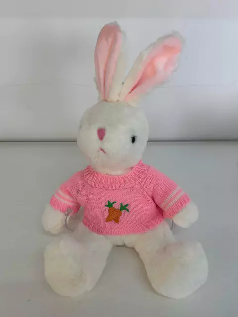 Coelho de pelúcia com roupa rosa com 30cm de altura.