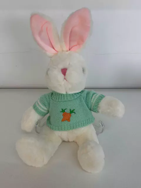 Coelho de pelúcia com roupa verde com 30cm de altura.