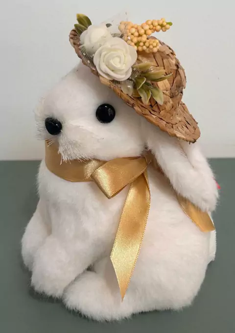 Coelho sentado pelúcia com chapéu com 17cm de altura.
