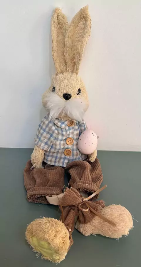 Coelho sentado com pernas moles, com roupa xadrez azul 50cm no total.