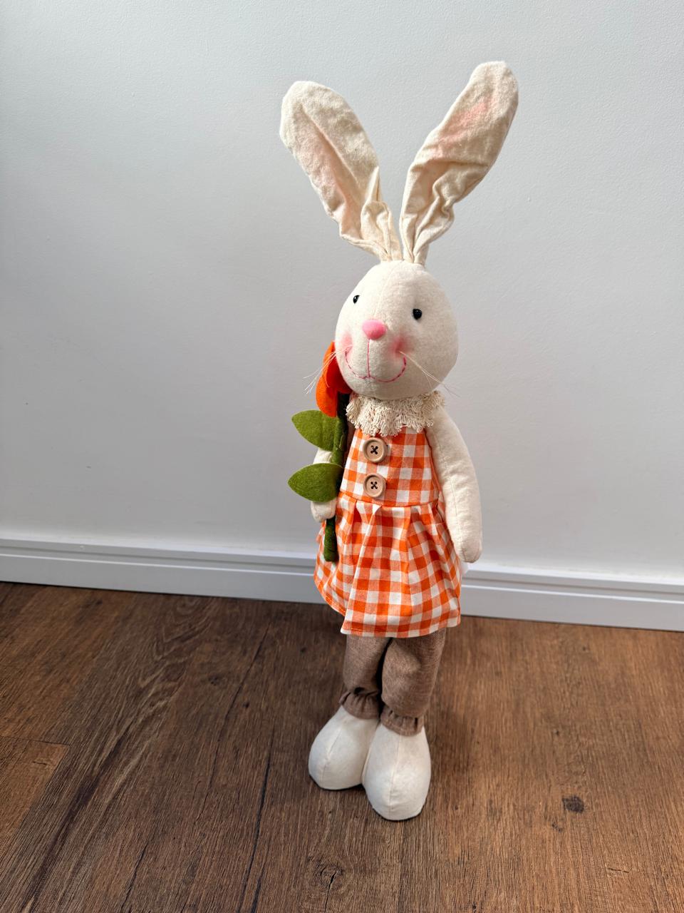 Coelho tecido em pé roupa xadrez laranja com 60cm de altura.