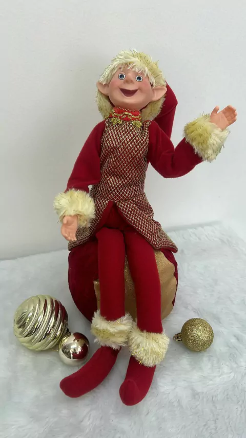 Duende menino com roupa vermelha e dourada sentado na bola com 50cm de altura.