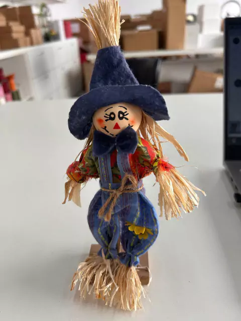 Espantalho decorativo Joca com base de madeira, com 23cm de altura.