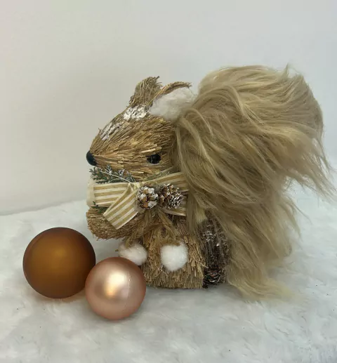 Esquilo em pé de palha natural com 19cm de altura.